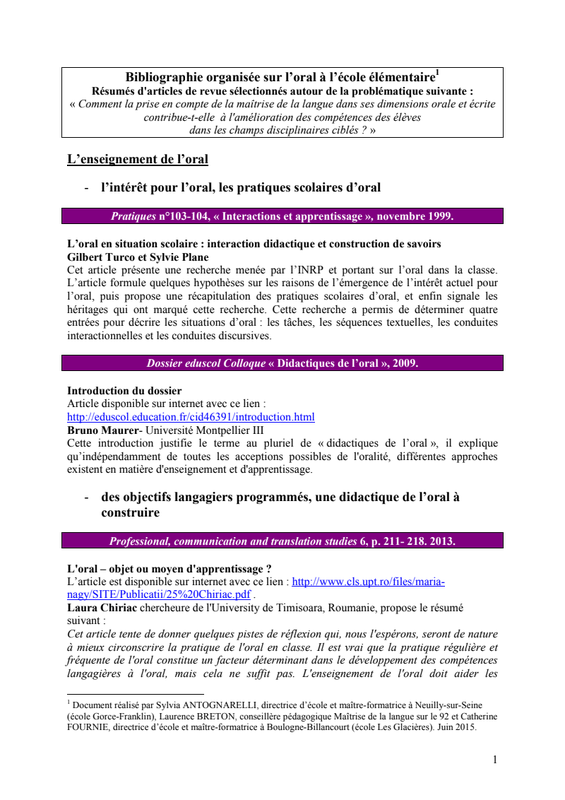 2015 09 15 Bibliographie Sur Oral Articles Scientifiques