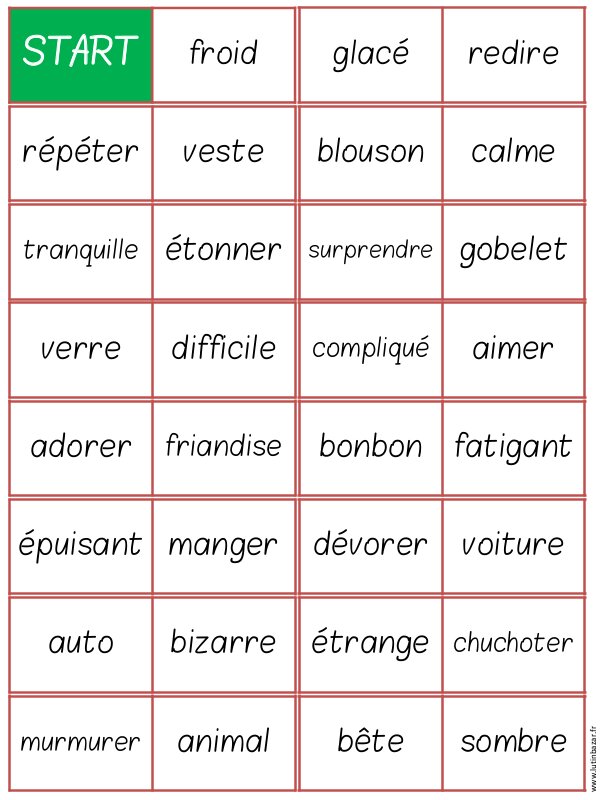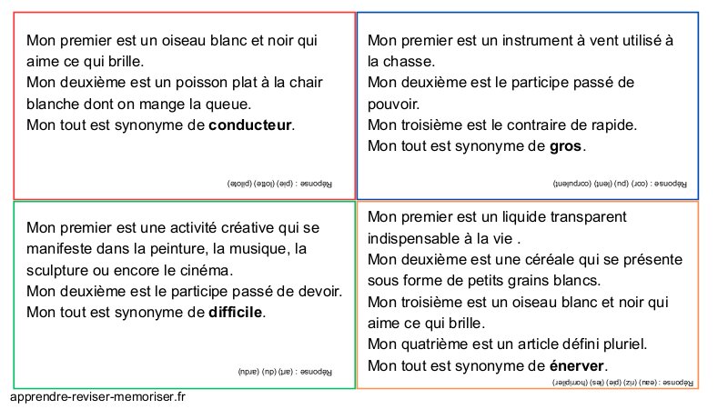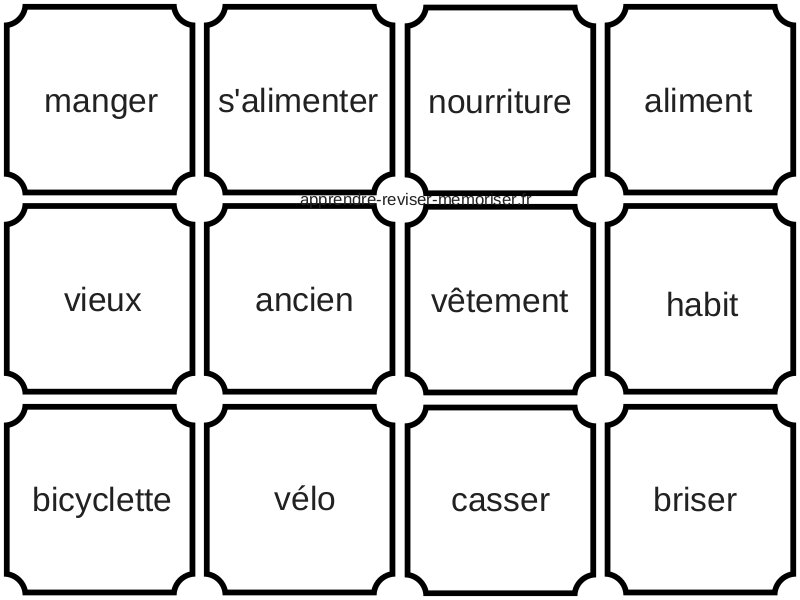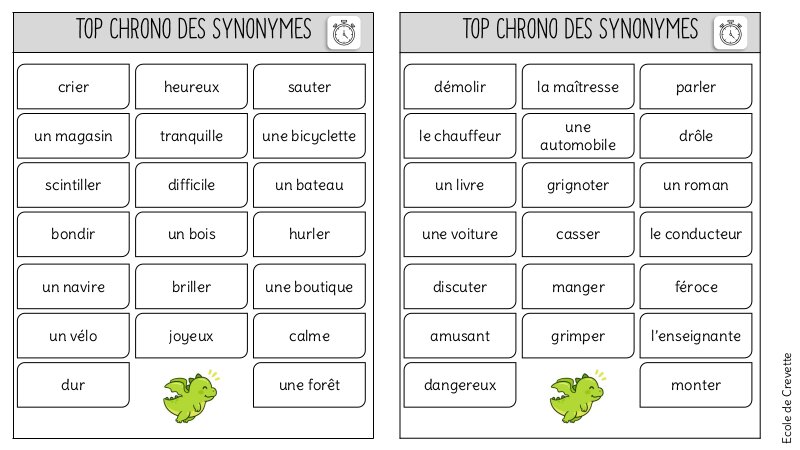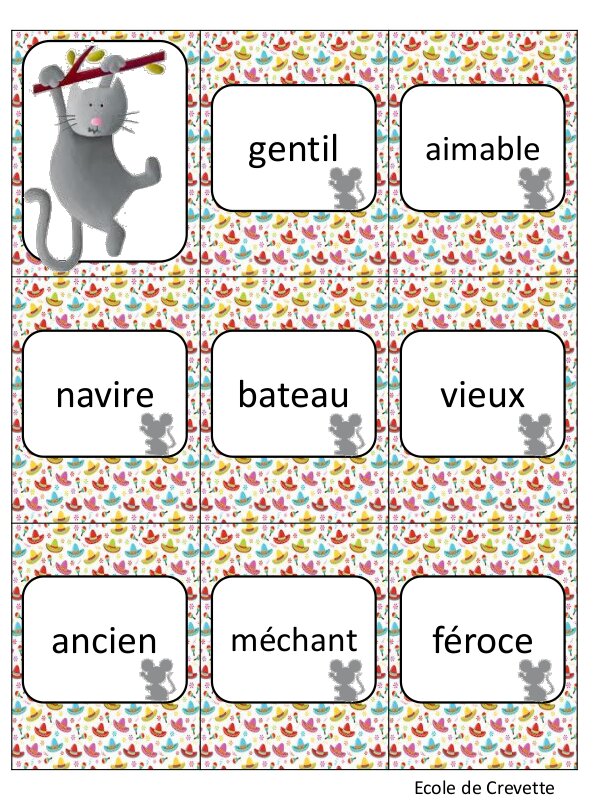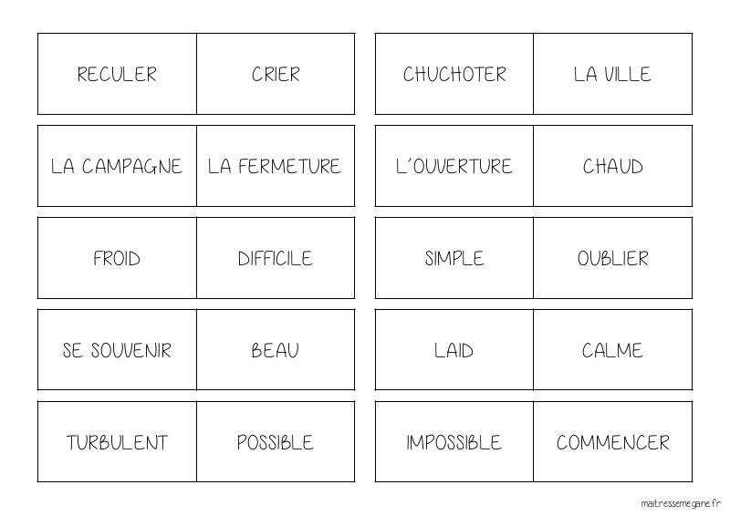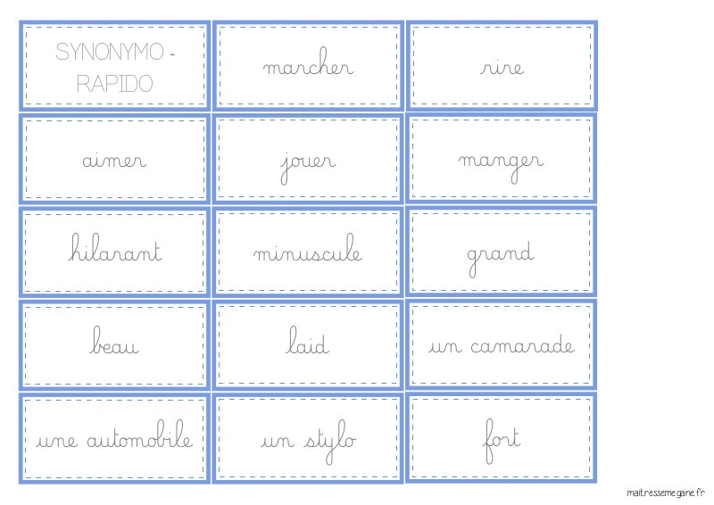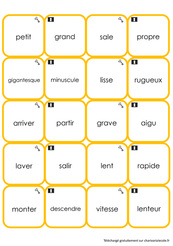 Les règles visent toutes à un travail d’association de 2 cartes soit avec 2 synonymes, 2 contraires ou 1 synonyme et 1 contraire en fonction de la notion que l’on souhaite travailler.