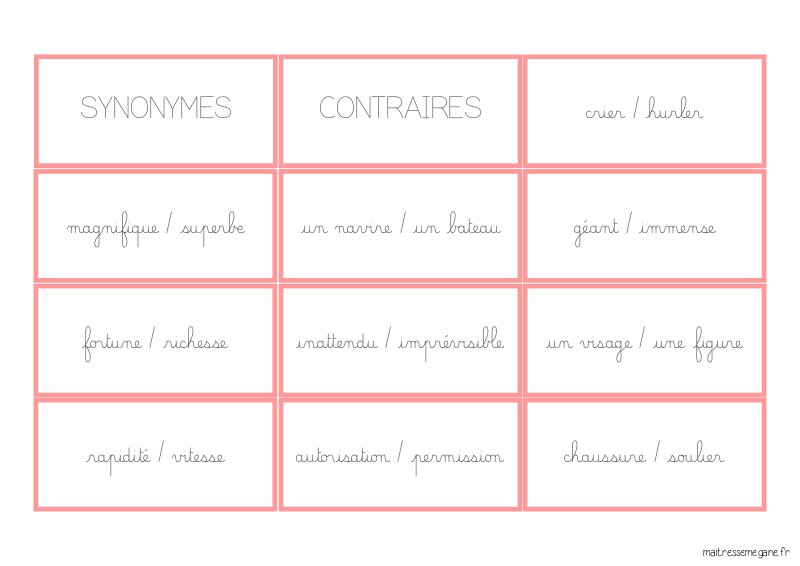Exemple : Séparer et Détacher sont synonymes. Fixer et Attacher sont synonymes et sont aussi les contraires de Détacher et Séparer.